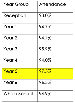 Year Group Attendance Congratulations Year 5 – super attendance!