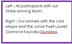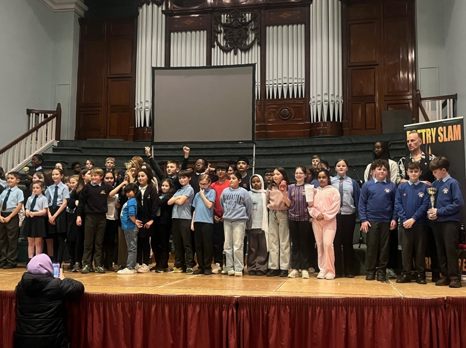Poetry Slam Huge congratulations to our Year 5 and 6 children who took part in this year’s Poetry Slam final on Wednesday evening. All 3 groups were incredible; they performed with confidence and rhythm. Emily-Lauren Jones, the poet who came to write our poems with us, emailed us and said, ‘a MASSIVE congratulations on your well-deserved win, it was a unanimous decision from the judges and it also makes you the first ever Coventry school to win the trophy!